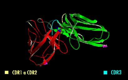 Keywords: ScFv-rotation.gif Animation showing a 3D model of single chain antibody scFV The complementatity determining regions CDRs are highlighted Author Tomas Moravec 2005-10-28 own assumed Xmort~commonswiki animated ribbon diagrams Antibodies Animated GIF Animations on black background |
