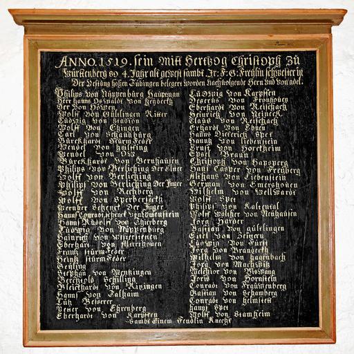 | Keywords: Schandtafel im Tübinger Schloss.JPG de Sogenannte Schandtafel im Tübinger Schloss Nachdem Herzog Ulrich von Württemberg 1534 sein Herzogtum zurückerobert hatte und nach Tübingen zurückgekehrt war war er über die kampflose Aufgabe der Tübinger Festung immer noch so verärgert dass er die seiner Meinung nach feigen und vertragsbrüchigen Adligen bis in alle Ewigkeit brandmarken wollte Er ließ die Namen dieser Ritter in goldenen Buchstaben auf eine schwarze žSchandtafel schreiben die daraufhin für jedermann sichtbar im Rittersaal von Schloss Hohentübingen angebracht wurde ANNO 1519 sein mitt Herzog Christoph zu Württemberg so 4 Jahr alt gewest sambt Jr F G Freulin Schwester in Der Vestung hohen Tübingen belegert worden nachfolgende Hern und von adel <br> Philips von Nüppenburg Hauptman <br> Herr Hans Oswald von Heydeck <br> Der von Höwen <br> Wolf von Gültlingen Ritter <br> Ludwig von Stadion <br> Wolf von Ehingen <br> Carl von Schaunburg <br> Burkhardt Sturmfeder <br> Wendel von Hailfing <br> Wendel von Ow <br> Burckhardt von Bernhausen <br> Philips von Berliching Der Eltter <br> Wolf von Berliching <br> Philips von Berliching der Jünger <br> Wolf von Rechberg <br> Wolf von Sperberseck <br> Werner Schenck Der Jünger <br> Hanns Conradt Schenck von Löwenstein <br> Hans Rudolff von Thierberg <br> Ludwig von Nüppenburg <br> Hainrich von Westerstetten <br> Eberhardt von Altershouen <br> Franz Sturmfeder <br> Heinz Sturmfeder <br> Geyling <br> Stephan von Mentzingen<sup>http //www deutsche-biographie de/sfz61810 html ADB</sup> <br> Berchtold Schilling <br> Bleichhardt von Ripingen <br> Hanns von Talhaim <br> Lutz Besserer <br> Petter von Ehrenberg <br> Eberhardt von Karpffen <br> Ludwig von Karpffen <br> Deserus von Fronhouen Dietrich von Fronsberg <br> Eberhardt von Reischach <br> Heinrich von Neineck<br> Claus von Reischach <br> Erhardt von Ebnen <br> Hanns Dietrich Spet <br> Hanns von Liebenstein <br> Ernst von Horckheim <br> Epsel Braun <br> Christoph von Habsperg <br> Hans Casper von Freyberg <br> Althans von Liebenstein <br> German von Emershouen <br> Wilhelm von Wellwardt <br> Wolff Spet <br> Philips von Kaltental <br> Wolf Walter von Neuhausen <br> Jörg Harder <br> Bastian von Gültlingen <br> Eitel von Zeittern <br> Ludwig von Fürst <br> Jörg von Brandeckh <br> Wilhelm von Hagenbach <br> Jörg von Machwitz <br> Melchior von Biswang <br> Doris von Hornstein <br> Conradt von Frauenberg <br> Bastian von Schamberg <br> Conradt von Helmstett <br> Hans Spet <br> Wolf von Stamheim <br> Sambt Einem Fendlin Knecht Siehe auch Johann Friedrich Eisenbach http //books google de/books id geA-AAAAcAAJ pg PA57 lpg PA57 dq Ludwig+von+N C3 BCppenburg source bl ots qJA6rVqVgX sig kJ9MVAZjd0BNnF8SCmCf2bMNT94 hl de sa X ei CzbAU9zfHezb7Aal9YDwBw ved 0CCQQ6AEwAA v onepage q Ludwig 20von 20N C3 BCppenburg f false Geschichte und Thaten Ulrichs Herzogen zu Würtemberg und Teck etc etc Berger 1754 Seite 57-58 Philipp Ludwig Hermann Röder http //books google de/books id B24AAAAAcAAJ pg PA555 lpg PA555 dq Ludwig+von+N C3 BCppenburg source bl ots FB3aL9si-r sig qeyA_mCQJPVvm4BXMGwKaX2q3YU hl de sa X ei CzbAU9zfHezb7Aal9YDwBw ved 0CCcQ6AEwAQ v onepage q Ludwig 20von 20N C3 BCppenburg f false Geographie und Statistik Wirtembergs Band 1 Korn 1787 Seite 554-556 Christian Friedrich Sattler http //books google de/books id Pec-AAAAcAAJ pg PA15 lpg PA15 dq 22Wilhelm+von+Hagenbach 22 source bl ots BENOQ0CJp4 sig CocXbCi1W_BJtQx2oAAWkImvJYM hl de sa X ei T0DCU6D8N-6e7AaVyoGYAg ved 0CCUQ6AEwAQ v onepage q 22Wilhelm 20von 20Hagenbach 22 f false Geschichte des Herzogthums Würtenberg unter der Regierung der Herzogen Zweyter Theil Mit 123 Urkunden und einigen Kupfern bestärket Band 2 Reiß 1770 Seite 14-15 1534 Tübinger Maler im Auftrag von Herzog Ulrich von Württemberg Um 1534 PD-old-100 Uploaded with UploadWizard Plaques in Tübingen 1519 in Tübingen |