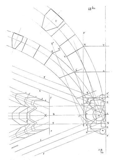 | Keywords: Schema.arcs.ogives.barlongs.2.png Voyons maintenant à tracer ces sommiers Soit 48 bis AB la directrice de l'arc doubleau AC les directrices des arcs ogives A est posé sur le nu du mur De ce point A prenant sur la ligne AB une longueur AD égale à l'épaisseur du claveau de l'arc doubleau et considérant AD comme rayon nous formons le demi-cercle D'DD Nous traçons alors la coupe de l'arc doubleau sur plan horizontal /Arch Drawings of arches Ogival Pointed arches Arch Viollet-le-Duc | ||||