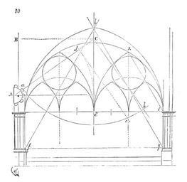 | Keywords: Schema.salle.synodale.Sens.2.png Si maintenant nous prenons un édifice ne possédant qu'un seul vaisseau voûté comme la salle synodale de Sens bâtie en même temps que le chœur de Beauvais nous verrons que l'architecte a procédé d'après une méthode semblable à celle que nous venons de décrire Un quart de travée de cette salle étant figuré en ABC fig 10 la voûte a d'abord été tracée c'est-à-dire que sur la projection horizontale AC de l'arc ogive on a tracé le demi-cercle <i>ab</i> qui est le rabattement de la moitié de cet arc; prenant sur le demi-diamètre <i>a</i>C une longueur <i>ad</i> égale à la moitié de la base de l'arc-doubleau et élevant une perpendiculaire de sur la ligne <i>a</i>C le point de rencontre <i>e</i> a donné la clef de l'arc-doubleau et <i>ae</i> sa courbe; donc <i>de</i> est la flèche de cet arc-doubleau Viollet-le-Duc Drawings by Eugène Viollet-le-Duc |