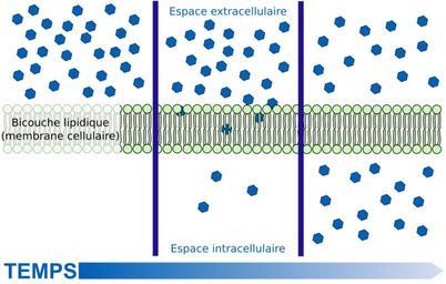 Keywords: Scheme simple diffusion in cell membrane-fr.svg en Simple diffusion the movement of particles from an area where their concentration is high to an area that has low concentration One of the different ways in wich molecules move in cells fr La diffusion simple est le mouvement des particules d'un compartiment dans lequel elles sont fortement concentrées vers un compartiment dans lequel elles sont faiblement concentrées C'est une des voies par laquelle des molécules peuvent entrer dans une cellule Translation of Image Scheme_simple_diffusion_in_cell_membrane-en svg 2007-02-04 English original ; 2010-09-15 French translation 2010-09-15 LadyofHats Le transport facilité implique l'utilisation de protéines pour faciliter le mouvement de molécules à travers la membrane Dans certains cas les molécules passe à travers un canal protéique Dans d'autres cas la protéine de transport change de conformation permettant le passage de la molécule Translation of Image Scheme facilitated diffusion in cell membrane-en svg Ultrastructure diagrams SVG diagrams in French Cell membrane |