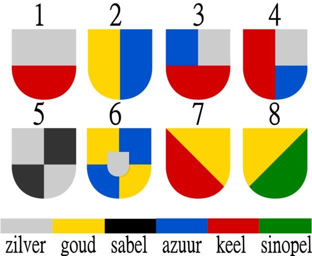 Keywords: Schildtopo nl.svg en Topographies of Coats of Arms 1 divided 2 split 3 and 4 hybrid of 1 and 2 5 und 6 mutton 7 und 8 tiled division Dutch version nl Topografie in de heraldiek 1 Doorgesneden 2 Gedeeld 3 Doorgesneden en halfgedeeld 4 Gedeeld en linksdoorgesneden 5 Gevierendeeld 6 Gevierendeeld met hartschild 7 Geschuind 8 Linksgeschuind File Schildtopographie MK88 svg Arch 2011 File Schildtopographie MK88 svg Based on File Schildtopographie MK88 svg of user Dr Schorsch Cc-zero Heraldic divisions Heraldic tinctures