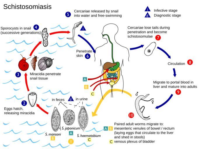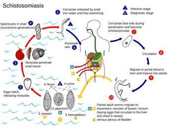Keywords: Schistosoma life cycle.svg en Eggs are eliminated with feces or urine 1 Under optimal conditions the eggs hatch and release miracidia 2 which swim and penetrate specific snail intermediate hosts 3 The stages in the snail include 2 generations of sporocysts 4 and the production of cercariae 5 Upon release from the snail the infective cercariae swim penetrate the skin of the human host 6 and shed their forked tail becoming schistosomulae 7 The schistosomulae migrate through several tissues and stages to their residence in the veins 8 9 Adult worms in humans reside in the mesenteric venules in various locations which at times seem to be specific for each species 10 For instance S japonicum is more frequently found in the superior mesenteric veins draining the small intestine A and S mansoni occurs more often in the superior mesenteric veins draining the large intestine B However both species can occupy either location and they are capable of moving between sites so it is not possible to state unequivocally that one species only occurs in one location S haematobium most often occurs in the venous plexus of bladder C but it can also be found in the rectal venules The females size 7 to 20 mm; males slightly smaller deposit eggs in the small venules of the portal and perivesical systems The eggs are moved progressively toward the lumen of the intestine S mansoni and S japonicum and of the bladder and ureters S haematobium and are eliminated with feces or urine respectively 1 2013-08-28 16 35 24 http //commons wikimedia org/wiki/File Schistosomiasis_Life_Cycle jpeg CDC cc-zero Uploaded with UploadWizard Schistosoma life cycle Theodor Bilharz |