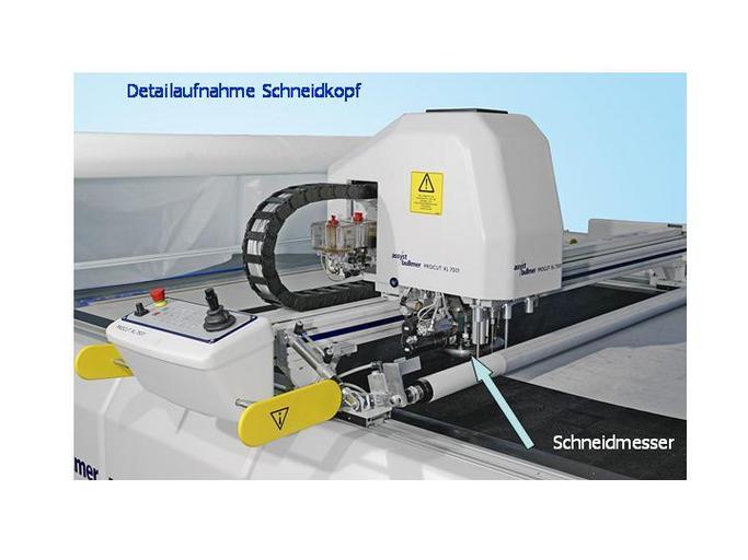 Keywords: Schneidkopf ProCut.jpg en Tool head of automatic NC-controlled cutting machine for textile materials Photo taken by myself on digital camera Thomas Heinrichs 2007-07-24 Cutting machines