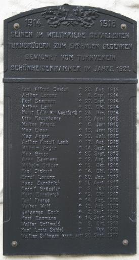Keywords: Schönheide im Erzgebirge Gedenktafel¬ Turner Erster Weltkrieg 2.jpg Schönheide im Erzgebirge - In den 2000er Jahren wurde diese gusseiserene Gedächtnistafel an der Außenwand des Bürsten- und Heimatmuseums angebracht Sie erinnert an die im Ersten Weltkrieg gestorbenen Turner aus Schönheiderhammer Die Tafel hat diesen Wortlaut 1914 “ 1918 Seinen im Weltkrieg gefallenen Turnbrüdern zum ehrenden Gedenken gewidmet vom Turnverein Schönheiderhammer im Jahre 1921 ANGER Max + 30 07 1915; BAUMANN Arno + 12 08 1916; BAUMANN Kurt + 14 09 1918; BAUMANN Paul + 27 09 1914; BERNBRICH Hans + 19 10 1917; BOCK Johannes + 02 09 1918; BRÄUER Wilhelm + 13 10 1916; EINER Max + 15 06 1915; FRIESS Walter + 06 06 1915; GOTTWALD Walter + 09 10 1918; GROPP Max + 25 09 1915; LENK Arthur + 30 10 1914; LENK Arthur Rudolf + 17 08 1915; LORENZ Arthur + 08 09 1914; LORENZ Emil + 30 01 1917; PREISS; Paul + 14 08 1918; QUERFURTH Horst Edler von + 24 11 1914; ROSENHAUER Otto + 12 04 1915; SEIDEL Paul Alfred + 20 08 1914; SEIDEL Paul Louis + 05 11 1918; SELBMANN Walter + 20 09 1917 vermisst; SICKERT Paul + 14 10 1916; WOLF Walter + 15 08 1918 Die Namensliste auf der Tafel ist in kalendarischer Reihenfolge und die Nachnamen sind nicht in Großbuchstaben gestaltet der Nachname steht nach den Vornamen Die Tafel ist aufgenommen in das Denkmalprojekt das Denkmale und ihre Inhalte beschreibt die an Tote der beiden Weltkrieg erinnern http //www denkmalprojekt org/2011/schoenheide_wk1_sachs html abgerufen am 2 Februar 2014 own Klaaschwotzer 2009-11-18 Schönheide Schönheiderhammer World War I sportsmen memorial of Schönheiderhammer Cc-zero |