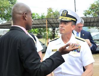 Keywords: School Dedication in Comoros DVIDS279169.jpg en Commander Combined Joint Task Force - Horn of Africa U S Navy Rear Admiral Brian L Losey left speaks with Mahmoud Abdourazak right a graduate student of the American-Corner before attending the Hamramba school dedication in Moroni Comoros May 11 U S Navy Mobile Construction Battalions and Comorian military engineers completed the two-year project consisting of eight classrooms and 10 latrines 2010-05-11 Petty Officer 2nd Class Joshua Bruns https //www dvidshub net/image/279169 100511-N-+++++-001 2010-05-14 18 21 MORONI KM PD-USGov-Military-Navy Combined Joint Task Force - Horn of Africa Images from DoD uploaded by Fæ |