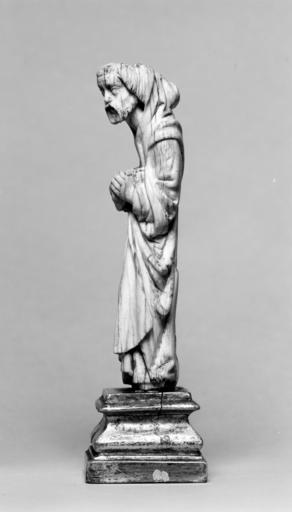 Keywords: School of Giovanni Pisano - Apostle or Prophet - Walters 71245 - Three Quarter.jpg This unusual bearded figure stands bent forward head projecting at a forty-five-degree angle his hood falling back off his head He holds an open book which forms an X with the folds of drapery below The straight folds on the front of the figure contrast with the shaper V-folds at the sides Although the back is flat as if the figure were intended to be seen against a background it is carved with vertical folds The eyes are half closed the mouth is partially open The projecting head and open mouth the boldness of the concept and the contained emotion of the figure relate it to the works of Giovanni Pisano The unusual treatment of the waist with the decided break in the composition is a favorite device of Pisano and may be seen in his Justice figure in the Palazzo Bianco Genoa among others The half-closed eyes also appear in the Justice The treatment of the figure's right knee under the drapery is paralleled in Pisano's Pisa Cathedral pulpit the sharp drapery folds in his ivory Madonna in the Pisa Cathedral However the composition and treatment are weaker in the Walters figure and the date seems to be more toward the middle of the century The base has been cut above the feet and minor alterations made to the hemline of the garments The surface was partially cleaned at one time There is a wide hole in the top of the hood 1st half Other date century 14 Medieval ivory cm 13 9 accession number 71 245 21591 Octave Homberg Collection Paris date and mode of acquisition unknown Homberg Sale Paris May 16 1908 lot 493 Léon Gruel Paris date and mode of acquisition unknown Henry Walters Baltimore date of acquisition unknown by purchase Walters Art Museum Henry Walters Acquired by Henry Walters place of origin Italy Walters Art Museum license Medieval ivory in the Walters Art Museum Giovanni Pisano Media contributed by the Walters Art Museum needs category review Media contributed by the Walters Art Museum needs artist update |