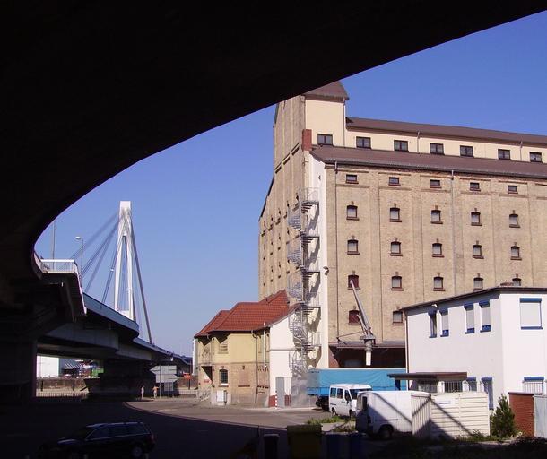 Keywords: Schumacherbruecke und Hafenanlagen in Ludwigshafen.jpg bridge in Ludwigshafen Germany 2006-07-18 own Immanuel Giel Ludwigshafen-Mitte Kurt-Schumacher-Brücke Mannheim