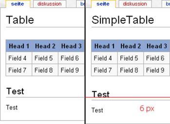 | Keywords: Screenshot-SimpleTable-bug.gif SimpleTable extension The left side is used for comparison and shows a table which was generated with the normal table syntax This bug causes all elements below the table to be displaced by six pixels SimpleTable-Erweiterung Die linke Seite dient zum Vergleich und stellt eine Tabelle dar die mit der normalen Tabellen-Syntax erzeugt wurde Durch diesen Bug verschieben sich Elemente unter der Tabelle um sechs Pixel own WikiMichi 2009-11-22 Screenshots of MediaWiki extensions Wikitable |
