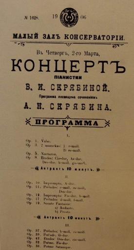 | Keywords: Scriabine Vera Afischa (Moskva 1906).jpg ru Афиша конце та Ве ы Ск ябиной ф агмент от 2 ма та 1906 года в п ог амме - только сочинения её мужа А Ск ябина к тому моменту фактически бывшего но ю идически - нет 2011-10-23 Book Александ иколаевич Ск ябин сост Е Рудакова узыка 1979 archives de --FinitoR эта афиша вообще не является п едметом авто ского п ава unidentified pre-revolutionary russian Tipograf PD-old-100 Uploaded with UploadWizard Vera Scriabina Alexander Scriabin | ||||