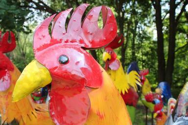 Keywords: sculpture art colorful rooster metal red whimsical