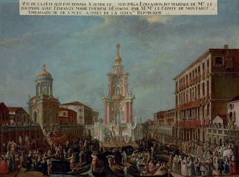 Keywords: Scuola veneziana - La celebrazione delle nozze del Delfino di Francia presso la Infanta Maria Teresa di Spagna, presso l'Ambasciata di Francia a Venezia, 1745.jpg Artwork anonymous LangSwitch Venetian School Scuola veneziana Venezianische Schule венецианской школы La celebrazione delle nozze del Delfino di Francia presso la Infanta Maria Teresa di Spagna presso l'Ambasciata di Francia a Venezia 1745 ca 1745 oil canvas cm 97 9 133 9 object history Comte Pierre-François de Montaigu and by descent to the present owner credit line <code>'VUE DE LA FÊTE QUI FUT DONNÉE VENISE LE MAY 1745 A L'OCCASION DU MARiAGE DE M<sup>G</sup> LE DAUPHIN AVEC L'INFANTE MARIE THÉRESE D ESPAGNE PAR S E M<sup>R</sup> LE COMTE DE MONTAIGU AMBASSADEUR DE S M T C AUPRÈS DE LA SEREN <sup>ME</sup> RÉPUBLiQUE'</code> ~ upper center text accession number Christie's online 5339085 7862 46 London 6 July 2010 PD-old-100 Wedding of Dauphin Louis 1745 Venetian paintings Paintings of Venice Marriage in art 1745 paintings |