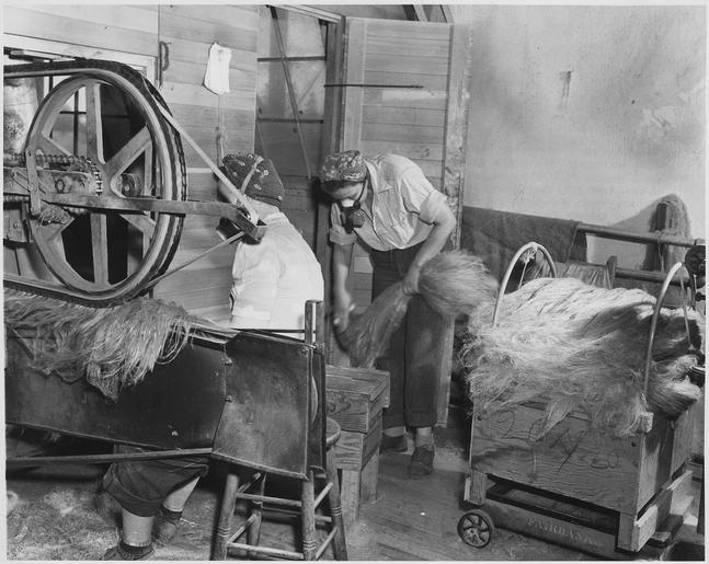 Keywords: Scutched fiber is removed from the scutcher and arranged for combing process - NARA - 283921.tif Scope and content Two operations breaking and scutching free the fiber in the flax stem from the woody parts The scutcher machine pictured can turn 3 1/2 tons of ratted flax into flas fiber in an 8-hour day Note the masks worn by workers to protect from dust and fluff particles General notes 283921 Local identifier Department of Agriculture Agricultural Research Service 06/17/1981 - NARA's Central Plains Region Kansas City NREA 400 West Pershing Road Kansas City MO 64108 other date ~ 1945 Record group Record Group 54 Records of the Bureau of Plant Industry Soils and Agricultural Engineering 1853 - 1977 Record group ARC 383 Flax Project Photographs compiled 1908 - 1977 Series ARC 283896 File unit File unit ARC Variant control numbers NAIL Control Number NRE-54-FP PHO -156 yes Other versions <gallery> File Scutched_fiber_is_removed_from_the_scutcher_and_arranged_for_combing_process_-_NARA_-_283921 tif tif File Scutched_fiber_is_removed_from_the_scutcher_and_arranged_for_combing_process_-_NARA_-_283921 jpg jpg </gallery> NARA-cooperation PD-USGov NARA TIF images with categorized JPGs Dressing flax 1940s fashion Women at work in World War II |