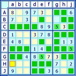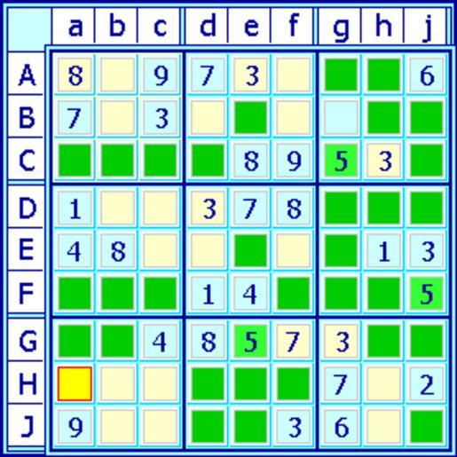 Keywords: Sdk ex01C.gif Exemple de sudoku avec candidat solitaire camouflé <br>La case Ha présente un candidat le 5 qui est un solitaire camouflé <b>hidden single</b> ; en effet la présence d'un 5 dans les cases Cg Fj et Ge empêche de placer un 5 dans les cases Ca Fa et Ga de la colonne a dans cette colonne la seule case qui reste disponible pour un 5 est donc la case Ha <br><br> Pour voir d'autres exemple analogues élimination directe mais plus simples cliquer ici Image Sdk ex01A1 gif ou ici Image Sdk ex01B gif <br> <br> Voir l'article Résolution d'un sudoku http //fr wikipedia org/wiki/Résolution_d'un_sudoku sur Wikipédia own 2007-05-22 Papy77 Sudoku |