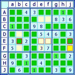 Keywords: Sdk ex03B.gif Exemple de sudoku avec élimination indirecte <br><br> <FONT SIZE 1 >Ici on travaille avec la valeur </FONT><FONT SIZE 1 COLOR red >1</FONT><FONT SIZE 1 > Les cases vides </FONT> <FONT SIZE 1 COLOR red >Ee</FONT><FONT SIZE 1 > et </FONT><FONT SIZE 1 COLOR red >Ef</FONT><FONT SIZE 1 > du pavé </FONT><FONT SIZE 1 COLOR 666666 >Yy</FONT><FONT SIZE 1 > permettent d'étendre les suppressions aux cases </FONT> <FONT SIZE 1 COLOR red >Eb</FONT><FONT SIZE 1 > et </FONT> <FONT SIZE 1 COLOR red >Ej</FONT> <FONT SIZE 1 > et l'on constate alors que dans le pavé </FONT> <FONT SIZE 1 COLOR red >Yz</FONT><FONT SIZE 1 > seule la case </FONT> <FONT SIZE 1 COLOR red >Fj</FONT><FONT SIZE 1 > en jaune reste libre et peut donc se voir attribuer la valeur </FONT> <FONT SIZE 1 COLOR red >1</FONT><FONT SIZE 1 > </FONT> <br> Pour voir d'autres exemples analogues élimination indirecte cliquer ici Image Sdk ex03A1 gif et Image Sdk ex03C1 gif <br> Voir l'article Résolution d'un sudoku http //fr wikipedia org/wiki/Résolution_d'un_sudoku sur Wikipédia own date Papy77 Sudoku |