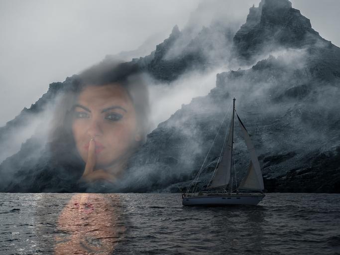 Keywords: sea boat rocks woman reflection mystical fantasy sails sailboat fun ocean water yacht vessel fog mist cliffs mountain female head head shot faded grey grey sky clouds