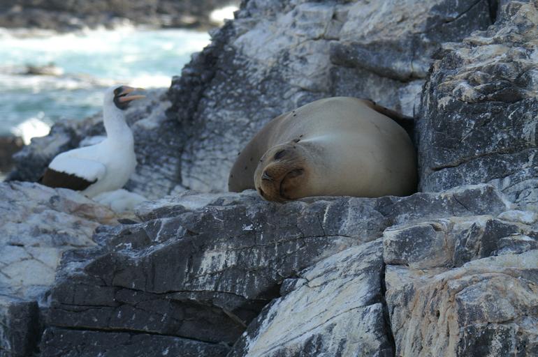 Keywords: sea lion sleeping seagull rock landscape sea blue animal bird holiday beach galapagos ecuador travel tourism