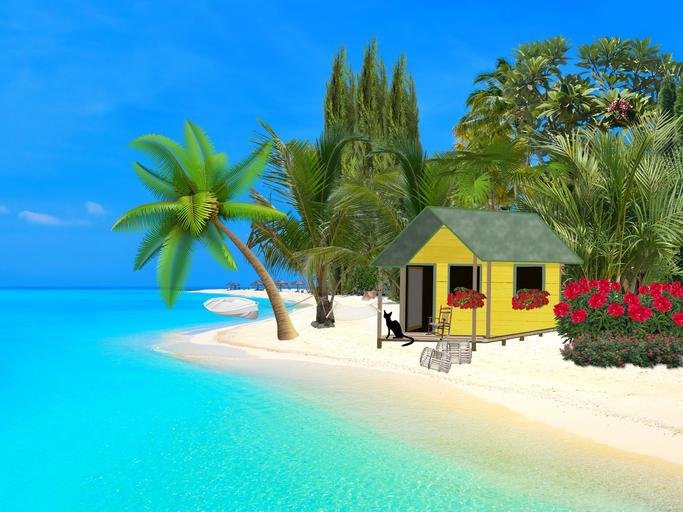 Keywords: sea ocean sand landscape beach tropics palm trees shed small house crates cabin water sandy beach holiday black cat flowers hammock seaside boats nature