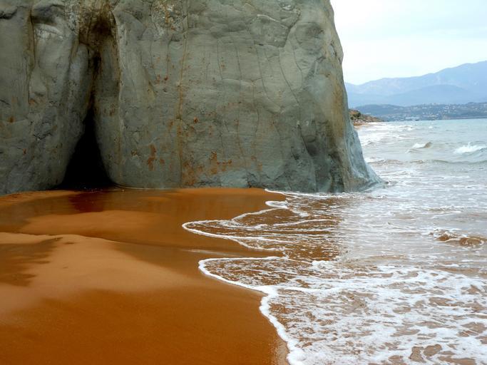 Keywords: sea sand red cliff water beach greece wave