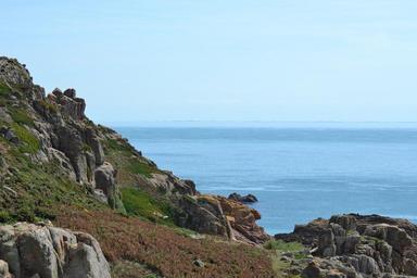 Keywords: sea view jersey rocks rock pools coastline blue sky afternoon hazy sun hot day blue see distant horizon rock flora channel islands