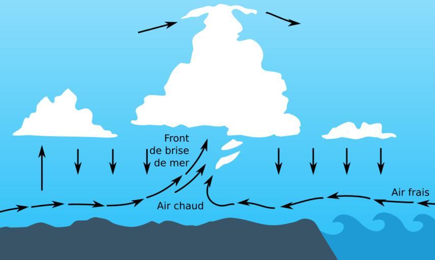 Keywords: SeaBreeze-fr.svg Schematic cross section through a sea breeze front If the air inland is moist cumulus often marks the front Le réchauffement de l'air au-dessus de la terre est plus rapide que celui au-dessus de la mer suite à la différence de capacité thermique entre les deux milieux Par ciel clair de jour il s'en suit un flux d'air qui est montré sur ce diagramme L'air chaud étant moins dense peut être repoussé en altitude par l'air plus frais venant de la mer le long du front de brise de mer Ce denier sera le plus souvent visible grâce à la présence de nuages convectifs de types cumulus si l'air chaud est assez humide En aval et en amont de ce front se trouvent par contre des zones de subsidence de l'air et donc un ciel généralement dégagé 2011-10-21 19 53 UTC SeaBreeze svg SeaBreeze svg SeaBreeze jpg U S FAA AC 00-6A Chapter 16 Figure 165 derivative work Malyszkz derivative work M0tty v fl Translation in French M0tty SeaBreeze svg Atelier graphique Schematic cross section through a sea breeze front If the air inland is moist cumulus often marks the front 2011-10-17 08 04 </nowiki> Uploaded with derivativeFX Sea and land breezes |