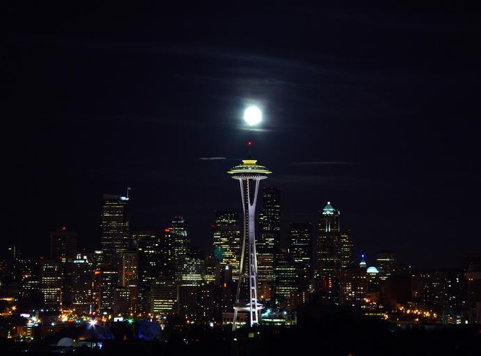 Keywords: seattle skyline space needle building city downtown night washington evening beautiful lights tower tranquil