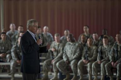 Keywords: SecDef visits Iraq 141209-D-DT527-113.jpg en Secretary of Defense Chuck Hagel addresses service members at Baghdad International Airport Iraq during a visit Dec 9 2014 Photo by Master Sgt Adrian Cadiz/Released 2014-12-09 Master Sgt Adrian Cadiz https //www dvidshub net/image/1692574 141209-D-DT527-113 2014-12-09 16 07 BAGHDAD IQ PD-USGov Chuck Hagel Images from DoD uploaded by Fæ |