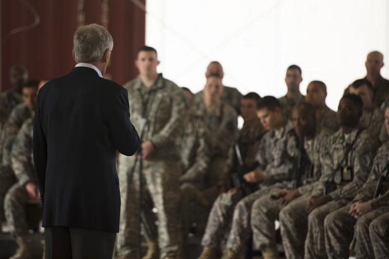 Keywords: SecDef visits Iraq 141209-D-DT527-137.jpg en Secretary of Defense Chuck Hagel addresses service members at Baghdad International Airport Iraq during a visit Dec 9 2014 Photo by Master Sgt Adrian Cadiz/Released 2014-12-09 Master Sgt Adrian Cadiz https //www dvidshub net/image/1692577 141209-D-DT527-137 2014-12-09 16 07 BAGHDAD IQ PD-USGov Chuck Hagel Images from DoD uploaded by Fæ |
