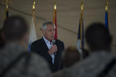 Keywords: SecDef visits Iraq 141209-D-DT527-082.jpg en Secretary of Defense Chuck Hagel addresses service members at Baghdad International Airport Iraq during a visit Dec 9 2014 Photo by Master Sgt Adrian Cadiz/Released 2014-12-09 Master Sgt Adrian Cadiz https //www dvidshub net/image/1692568 141209-D-DT527-082 2014-12-09 16 06 BAGHDAD IQ PD-USGov Chuck Hagel Images from DoD uploaded by Fæ |