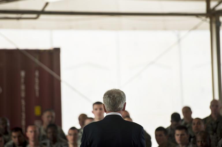 Keywords: SecDef visits Iraq 141209-D-DT527-141.jpg en Secretary of Defense Chuck Hagel addresses service members at Baghdad International Airport Iraq during a visit Dec 9 2014 Photo by Master Sgt Adrian Cadiz/Released 2014-12-09 Master Sgt Adrian Cadiz https //www dvidshub net/image/1692578 141209-D-DT527-141 2014-12-09 16 07 BAGHDAD IQ PD-USGov Chuck Hagel Images from DoD uploaded by Fæ |