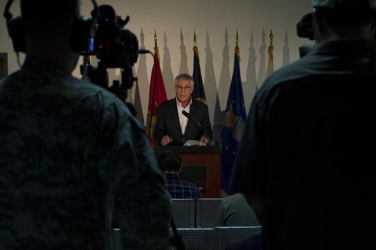 Keywords: SecDef visits Iraq 141209-D-DT527-474.jpg en Secretary of Defense Chuck Hagel speaks with members of the media at Baghdad International Airport Iraq during a visit there Dec 9 2014 Photo by Master Sgt Adrian Cadiz 2014-12-09 Master Sgt Adrian Cadiz https //www dvidshub net/image/1692596 141209-D-DT527-474 2014-12-09 16 11 BAGHDAD IQ PD-USGov Chuck Hagel Images from DoD uploaded by Fæ |