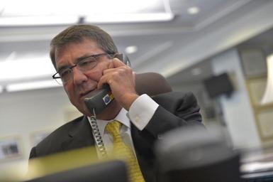 Keywords: Secretary of defense congratulates first women to graduate from US Army Ranger School 150820-D-NI589-050.jpg en Secretary of Defense Ash Carter speaks by phone with Army 1st Lt Shaye Haver and 1st Lt Kristen Griest to congratulate the two for their recent graduation from the rigorous Army Ranger School from his office at the Pentagon Aug 20 2015 Haver and Griest are the first women to successfully complete the course after the Army began allowing women to participate in the elite program DOD Photo by Glenn Fawcett/Released 2015-08-20 Glenn Fawcett https //www dvidshub net/image/2133405 150820-D-NI589-050 2015-08-20 12 59 PENTAGON DC US 3 PD-USGov Ashton Carter Images from DoD uploaded by Fæ Photographs by Glenn Fawcett |