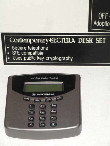 Keywords: SECTERA desk set, STE compatible secure telephone - National Cryptologic Museum - DSC07938.JPG en Exhibit in the National Cryptologic Museum Fort Meade Maryland USA All items in this museum are unclassified; items created by the United States Government are not subject to copyright restrictions 2013-03-29 11 05 17 own Daderot cc-zero Uploaded with UploadWizard Sectéra Edge Sectéra Secure Module Cryptographic devices Motorola Secure telephones Public-key cryptography Desk sets Voice encryption devices in the National Cryptologic Museum |