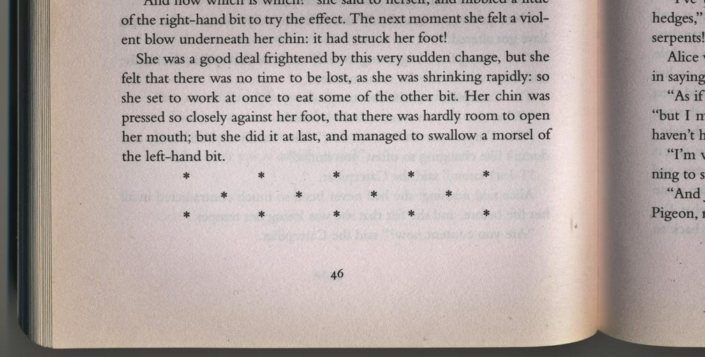 Keywords: Section break 02 by Pengo.jpg Alice in Wonderland 1865 opened to Chapter 5 page 46 to illustrate a section break Alice in Wonderland was first published in 1865 and is now public domain The complete text of the book is available on Wikisource own Pengo 2010-11-04 The original work is public domain Author died more than 70 years ago I also release this derivative work into the public domain see below <gallery> File Section break 01 by Pengo jpg Two page spread File De Alice's Abenteuer im Wunderland Carroll pic stars jpg The stars only </gallery> PD-old Alice in Wonderland Section breaks |