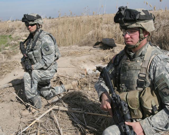 Keywords: Security DVIDS15554.jpg en 1st Lt Paul Worley right and Command Sgt Major Marc Pfrogner 2nd Battalion 502nd Infantry Regiment 2nd Brigade Combat Team 101st Airborne Division pull security as the Soldiers of 3rd Platoon Company A move and organize the weapons munitions and explosives discovered south of Baghdad Feb 21 U S Army photo by Spc Kelly McDowell 2nd BCT PAO 101st Abn Div 2006-02-21 Spc Kelly McDowell https //www dvidshub net/image/15554 15554 2006-02-23 11 45 BAGHDAD IQ PD-USGov 101st Airborne Division Images from DoD uploaded by Fæ |