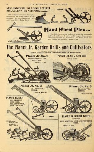 | Keywords: Seed annual (16264117280).jpg D M FERRY CO DETROIT MICH <br> NEW UNIVERSAL NO 2 SINGLE WHEEL <br> HOE CULTIVATOR AND PLOW <br> This implement is same as the regular <br> Single Wheel Hoe except that the attach- <br> ments are 1 pair Hoes 3 Cultivator Teet <br> and 1 Large Plow Price 4 35 <br> Hand fVheel Plow <br> This little labor-saving implement is one that commends <br> itself to all gardeners It can be used to prepare the ground to <br> furrow out to cover and to cultivate The mould board is of <br> steel polished and tempered Price 3 25 <br> Tbe Planet Jr Garden Drills and Cultivators <br> Planet Jr No 1 <br> COMBINED DRILL AND <br> WHEEL HOE <br> PRICE 10 50 <br> WE CARRY A FULL LINE OP THESE MACHINES <br> COMPLETE DESCRIPTIVE CATALOGUE FREE ON APPLICATION <br> PLANET JR No 2 Seed Drill <br> PRICE 7 75 <br> Planet Jr No 3 <br> HILL DROPPING <br> SEEDER <br> PRICE 11 00 <br> Planet Jr No 3 <br> HILL DROPPING <br> SEEDER <br> PRICE 14 00 <br> PLANET JR DOIBLE WHEEL <br> COMBINED <br> HILL DROPPING SEED AND FERTILIZER <br> DRILL <br> PRICE 19 00 43827987 149307 77819 Page 98 Text http //www biodiversitylibrary org/page/43827987 1921 10 5962/bhl title 77819 D M Ferry Co ; Henry G Gilbert Nursery and Seed Trade Catalog Collection Biodiversity Heritage Library Seed annual Garden Stories Detroit Equipment and supplies Flowers Gardening Michigan Nursery stock Seed industry and trade Seeds Vegetables U S Department of Agriculture National Agricultural Library bhl page 43827987 dc identifier http //biodiversitylibrary org/page/43827987 DM Ferry Co bhlGardenStories Garden Drills BHLinbloom u s department of agriculture national agricultural library dm ferry co bhlgardenstories garden drills bhlinbloom Information field Flickr posted date ISOdate 2015-02-05 CC-BY-2 0 BioDivLibrary https //flickr com/photos/61021753 N02/16264117280 2015-08-24 04 55 59 cc-by-2 0 PD-old-70-1923 1900 D M Ferry seed catalog Photos uploaded from Flickr by Fæ using a script Ploughs |