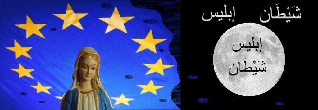 Keywords: When I look at the European flag, I see Maria crown of stars making with hope the dark night blue again When I see DAESH flag, I see a moon with no star leaving the sky in deepest darkness. Just a moon barely reflect the Sun light without having his own, DAESH faith is just a pale glowing copy of the bright shining faith in a real God. Whatever DAESH wrote on its flag, the names I read are Iblīs & Shayṭān en.wikipedia.org/wiki/Devil_(Islam) Moon is of course a usual Muslim symbol, but in such case, it is always an humble Crescent, not a pretentious full one. Thefore the real Muslim moon doesn't hide the star of wisdom given to Solomon, with the 5 brenchs, one for each Islam pillars forgotten, just as wisdom by DAESH Maria was a Jewish girl, niece of a Rabbin. She is also known by the Muslims as Maryam, mother of the prophet Îsâ. Moreover, some Hinduists make pilgrimages to Lourdes consediring the apparition as one of their goddess one. When I look at the European flag, I see Maria crown of stars making with hope the dark night blue again When I see DAESH flag, I see a moon with no star leaving the sky in deepest darkness. Just a moon barely reflect the Sun light without having his own, DAESH faith is just a pale glowing copy of the bright shining faith in a real God. Whatever DAESH wrote on its flag, the names I read are Iblīs & Shayṭān en.wikipedia.org/wiki/Devil_(Islam) Moon is of course a usual Muslim symbol, but in such case, it is always an humble Crescent, not a pretentious full one. Thefore the real Muslim moon doesn't hide the star of wisdom given to Solomon, with the 5 brenchs, one for each Islam pillars forgotten, just as wisdom by DAESH Maria was a Jewish girl, niece of a Rabbin. She is also known by the Muslims as Maryam, mother of the prophet Îsâ. Moreover, some Hinduists make pilgrimages to Lourdes consediring the apparition as one of their goddess one. |