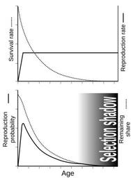 Keywords: Selection shadow.svg translate yes Die à berlebensrate l<sub>x</sub> - und Reproduktionsrate m<sub>x</sub> oben und die Wahrscheinlichkeit der Reproduktion und der Anteil der überlebenden Reproduktion bei einem individuellen Alter x-Achse einer hypothetischen nicht-alternden Population Die Reproduktionswahrscheinblichkeit zum Alter x ergibt sich als Produkt von l<sub>x</sub> und m<sub>x</sub> Der Anteil der überlebenden Reproduktion kann als Maß für die Stärke der natürlichen Selektion zum Alter x gesehen werden Der Einfluss der natürlichen Selektion nimmt mit zunehmendem Alter ab da sich nur sehr wenige Individuen in hohem Alter reproduzieren können Die meisten sterben zuvor Nachteilige Gene der natürlichenn Selektion entkommen wenn diese Nachteile erst im sogenannten Sekeltionsschatten auftreten Daten von Source B J Zwaan http //www nature com/hdy/journal/v82/n6/full/6885440a html The evolutionary genetics of ageing and longevity In Heredity 82 1999 S 589 “597 DOI 10 1046/j 1365-2540 1999 00544 x own Data from Source 2010-08-29 Kuebi Armin Kübelbeck en Gerontology |