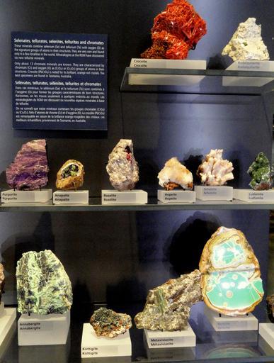 Keywords: Selenates etc. - Royal Ontario Museum - DSC00229.JPG Exhibit in the Royal Ontario Museum Toronto Ontario Canada Photography was permitted in the museum I took this photograph and release it into the public domain Daderot 2011-11-21 12 54 39 Daderot cc0 cc0 Mineral gallery at the Royal Ontario Museum |