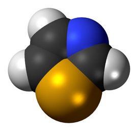 | Keywords: Selenazole-3D-spacefill.png Space-filling model of the selenazole molecule a heterocycle Colour code 505050 Carbon C black<br> F0F0F0 Hydrogen H white<br> 3C50FA Nitrogen N blue<br> EBB400 Selenium Se yellow-brown<br> 2011-06-01 own DS Visualizer Jynto talk Ball-and-stick version cc-zero Selenium heterocycles Azoles Simple aromatic rings Images by Jynto |