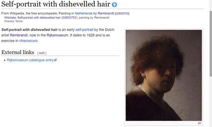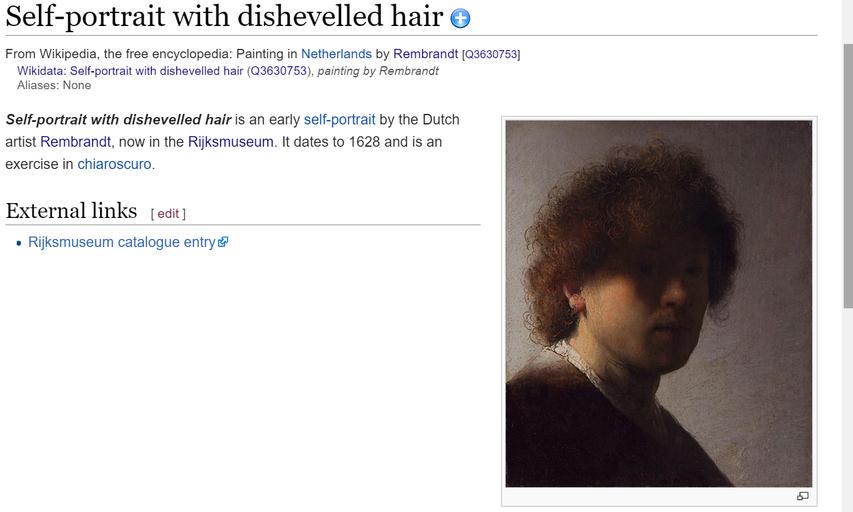 Keywords: Self Portrait of Rembrandt aged 21 Rijksmuseum - enwiki article 25-jun-2016.png en Screenshof of enwiki article about Rembrandt painting used as an example for Wikimania 2016 https //wikimania2016 wikimedia org/wiki/User_digest/GLAM <br>https //en wikipedia org/wiki/Self-portrait_with_dishevelled_hair <br> https //pl wikipedia org/wiki/Autoportret_ Rembrandt <br> https //it wikipedia org/wiki/Autoritratto_con_capelli_scompigliati <br> https //nl wikipedia org/wiki/Zelfportret_op_jeugdige_leeftijd_ 1628 <br> https //www wikidata org/wiki/Q3630753 <br> https //tools wmflabs org/glamtools/glamorgan html <br> https //en wikipedia org/wiki/List_of_paintings_by_Rembrandt 2016-06-25 own Jane023 cc-by-sa PD-Art-100 other versions <gallery>File Zelfportret Rijksmuseum SK-A-4691 jpeg from GLAM 0 views in 2016-01 Category Self-portrait Rembrandt c 1628 File Self-portrait 1628-1629 by Rembrandt jpg enwiki it wiki nlwiki 79 593 views in 2016-01 Category Self-portrait Rembrandt c 1628 File Rembrandt Harmensz van Rijn - Zelfportret op jeugdige leeftijd - Google Art Project jpg Wikidata item LIst of Rembrandt paintings 11 211 views in 2016-01 Category Self-portrait Rembrandt c 1628 File Rembrandt-self-portrait-1628 jpg plwiki 21 002 views in 2016-01 Category Self-portrait Rembrandt After 1628 Gemäldegalerie Alte Meister Kassel </gallery> cc-by-sa-4 0 Wikimania 2016 - GLAM Wikipedia screenshots