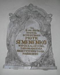 | Keywords: Semenenko kosciol Sw Wawrzynca.JPG en Piotr Peter Semenenko baptism place commemoration plaque Piotra Semenenko own Stanradziwon 2010-05-06 praca wlasna / own work Fotografia zrobiona osobiscie bez restrykcji odnosnie praw autorskich 1814 births Church of St Lawrence in Dolistowo Roman Catholic monks 1886 deaths Roman Catholic theologians |