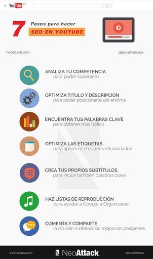 Keywords: seo youtube infografia posicionamiento posicionar buscadores google español tutorial guia SEO en Youtube: Tú también puedes ser lo más visto Para ver el artículo entero neoattack.com/seo-en-youtube-tutorial-de-posicionamiento-... Con el SEO en Youtube tú también puedes ser lo más visto de este buscador. Tras 10 años de vida, YouTube se encuentra en la tercera web más visitada del mundo, después de Google y Facebook. Cada segundo se sube una hora de contenido, proporcionando más de 31 millones de horas de video al año. Y te preguntarás entonces, ¿cuántas visitas se acumula en YouTube? Ni más ni menos que 800 millones de visitas únicas cada año, moviendo así miles y miles de euros. Saber qué es lo que marca la diferencia entre un canal visitado y un canal en el olvido, es tener presente siempre el SEO de tus vídeos, para posicionarte entre lo más visitado. Es cierto que existe mucha competencia, y si lo que pretendes es enganchar a tu público objetivo para mostrarles tu producto, página web, tienda online o blog, necesitarás saber lo más importante del SEO. Si también quieres posicionar tu blog te recomendamos nuestro post de SEO “Cómo aumentar las visitas de mi blog”. En España ya se han pronunciado algunos de los expertos en el posicionamiento de vídeos. Un caso es el conocido “Youtuber” Rubén Doblas Gundersen (llamado el “Rubius”) el cual creó su canal en diciembre de 2011 y a día de hoy tiene más de 12 millones de suscriptores, con 120 millones de reproducciones al mes. Estudiaba un curso de animación 3D y decidió subir un vídeo jugando al Skyrim. Poco a poco se hizo con la manera de vender su marca personal en forma de vídeos, hasta llegar a tener cifras de visitas inimaginables. Al igual que cualquier otra marca, lo fundamental es fijarte en los pilares del posicionamiento de vídeo, y sobre todo, hacerlo bien. Nosotros lo tenemos muy claro, ¿y tú? Si necesitas que alguien te eche una mano o te gustaría seguir mejorando, sigue leyendo esta información que no te puedes perder. Vídeo tutorial – Cómo posicionar un vídeo en Youtube Y si no te apetece leer el post, siempre puedes ver nuestro video tutorial “Seo para Youtube: Tutorial de posicionamiento de videos en 2016″ ¿Existes en la red? Sólo con SEO SEO proviene de Search Engine Optimization (optimización de motores de búsqueda), y a veces parece que nos olvidamos de su significado, porque cuando intentamos posicionar nuestra web, o en este caso nuestro vídeo en YouTube, no salimos airosos en el proceso de afectar a la visibilidad en un motor de búsqueda. Si no utilizamos de forma correcta todos los pasos del SEO, Google no identificará como tal nuestro vídeo en YouTube, y se mantendrá oculto entre la multitud de contenido informativo. Con la globalización de los medios de comunicación y la transformación que ha conllevado esto, Internet es una plataforma con acceso por parte de todo el mundo. Millones de personas pueden compartir sus contenidos: blogs, vídeos, páginas web, MOOC, COOC, tiendas online…Y éstos, como tú, luchan por ese posicionamiento tan deseado. Observarás que no es tarea fácil. Descubre todo sobre el SEO para Youtube y empieza a existir entre la montaña de información que hay en Internet. Pasos para hacer SEO en Youtube Analiza a tu competencia Después de analizar la cantidad de contenido que se sube en YouTube y las miles de visitas que hay cada día, es fácil asustarse cuando pretendes posicionar un vídeo en la plataforma. Pero no es imposible. Primero de todo hay que saber muy bien quién es tu competencia, sea de lo que sea, para analizar que están haciendo bien, qué contenido presentan, cuántas reproducciones y cuántos comentarios tienen, y cómo utilizan las etiquetas. Esto te ayudará a guiarte a la hora de dirigir un vídeo en YouTube. Para analizar a tu competencia puedes usar la herramienta VidIQ, aunque las funciones que ofrece de pago son mucho más amplias, en su versión gratuita podrás: Sacar todas los tags que ha usado tu competencia Ver el volumen de búsqueda Ver la competencia de la palabra clave competencia seo youtube Imagen competencia seo en vídeos youtube Título y descripción Título llamativo con tus keywwords Probablemente el posicionamiento SEO sea lo más olvidado a la hora de subir un vídeo en YouTube, y lo más importante a tener en cuenta. El título es lo que impacta en nuestra vista, nos atrae y nos incita a clicar en el vídeo. Necesitamos un título sugerente, llamativo y decisivo. E incluso así, muchas veces leemos después su descripción y nos tiramos hacía atrás. Descripción enfocada a SEO Segunda cosa que debemos de tener en cuenta: la descripción. Ni muy larga ni muy corta, hay que ajustarla a nuestros ojos, de forma entendible, y teniendo en cuenta lo que busca nuestro público objetivo. Unas 200 palabras debería de tener, añadiendo siempre el mayor número de palabras clave posible. Eso sí, ¡vigila! no vaya a ser que por repetir muchas palabras clave tengas una penalización por parte de Google. Acompaña también el primer párrafo con la URL externa de una web si es que tiene sentido o URL de sitios web que menciones en tu vídeo para facilitar la búsqueda a tu público. Por ejemplo, si has grabado un vídeo que tiene relación con un artículo de tu blog, enlaza desde la descripción del vídeo (a poder ser en el primer párrafo) a tu artículo para darle más potencia. Encuentra tus palabras clave Las palabras clave hacen referencia a los criterios de búsqueda que se utilizan en Internet para encontrar determinada información. Por eso, hay que tener muy claro qué palabras quieres indicar, porque serán las que crearán tu vinculación con tu audiencia. Con Google Trends, Google KeyWord Planer o UbberSuggest podrás organizar la lista de palabras claves a tu medida. “Te recomendamos este tutorial de Google Trends en Español para ser un experto en esta