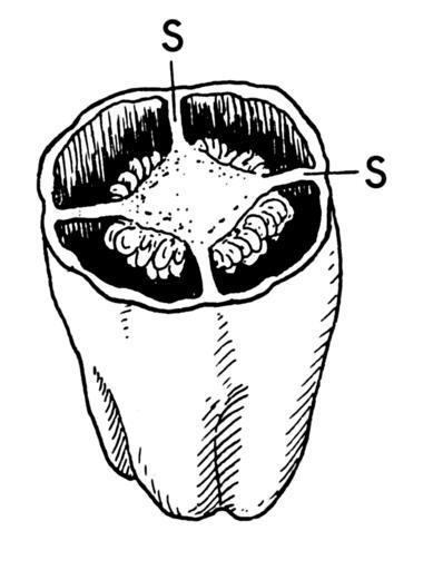 Keywords: Septum (PSF).png Line art drawing of a septum botanic The two lines departing from two label S show two of the septum present in the figure PSFa S-830001 png Fruit diagrams
