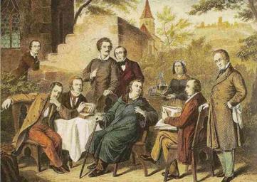 Keywords: Seracher Dichterkreis.jpg Graf Alexander von Württemberg und seine Dichterfreunde im Garten Justinus Kerners in Weinsberg Von links Theobald Kerner Nikolaus Lenau Gustav Schwab Graf Alexander von Württemberg Karl Mayer Justinus Kerner Friederike Kerner Ludwig Uhland Karl August Varnhagen von Ense http //www goethezeitportal de/index php id 6422 Goethezeitportal 1866 kolorierter Stich nach einem verschollenen Ölgemälde von Heinrich von Rustige 1810 “1900 Reproduction of a painting that is in the public domain because of its age File Die Gartenlaube 1866 b 005 jpg PD-old-100 Weinsberg Alexander of Württemberg 1801 “1844 Justinus Kerner Theobald Kerner Friederike Kerner Ludwig Uhland Karl August Varnhagen von Ense Nikolaus Lenau Gustav Schwab Heinrich von Rustige |
