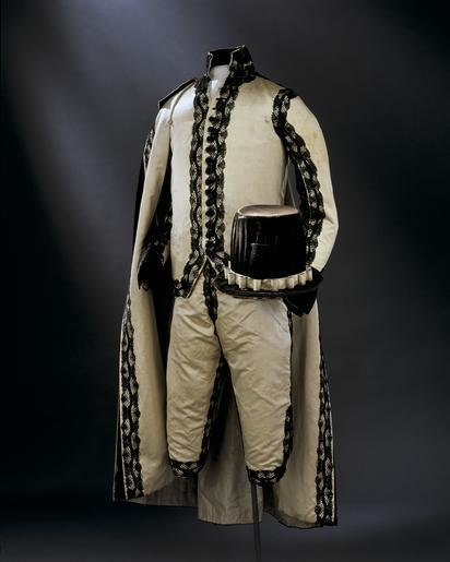 Keywords: Serafimerdräkt - Livrustkammaren - 30562.tif LSH artwork sv Jacka av vit sidenatlas fodrad med svart siden sydd med en söm mitt bak samt två sidsömmar som bildar två ryggstycken och två framstycken Jackan kantas med svart spets som även täcker samtliga sömmar Spetsbanden är 50 mm breda av svart silkestråd med en knypplad slinga i mitten kantad av galler samt en kraftigare svart silkestråd i ett ringlande snörmakeriarbete omgivet av en konturtråd Jackans framstycken är mot varandra rundade snett skurna nedtill Knäppning mitt fram med en knapprad på höger framstycke bestående av 16 höga små runda knappar garnerade med snörmakeriarbete av svart silkestråd bildande ett strålformigt mönster På vänster slag sitter motsvarande knapphål 25 mm breda kantade med svarta silkesstygn i kanten överlappad av den svarta spetsen som kantar slaget Mitt på vardera framstycke en djup iskuren ficka markerad med en 48 mm bred slå Från midjan ett skört med trapetsformade skörtkappor 185 mm höga Skörtkapporna kantas med svart spets På insidan av jackan vid höger framstycke sitter en sleif 72 x 35 mm med ett knapphål En 70 mm hög ståndkrage garnerad med en dubbel rad av svart spets På höger sida intill kragen sitter en knapp med ett axelsnöre av svart silkestråd Långa smala ärmar med tre svarta spetsband Mellan spetsarna mitt på ärmens insida en 190 mm lång slits med foder av svart siden Svart taftsiden vid ärmsluten 70 mm brett omvikt 10 mm på ärmens insida Ärmarna har nedtill ett sprund 120 mm högt med en knäppning bestående av en knapprad med tre knappar samt motsvarande knapphål 20 mm breda Sprundet är kantat med svart spets Vid sidan av vardera ärm sitter en liten vit sidenklädd knapp för fäste av manteln original caption Serafimerdräkt - 1750 1803 taffeta Färg svart d2 - dräkt - foder material taft - silk Färg svart d7 - dräkt - dekor material silkestråd size mm 735 mitt fram size mm 705 mitt bak LRK Fredrik Adolf av Östergötland Fest och fritid vid hovet 2003 place of origin original filename lm_t07140 55994 inventory number LRK 19386 30562 CC-BY-SA Ceremonial robes of the Order of the Seraphim Media contributed by LSH unmatched material Media contributed by LSH dim-with multiple size templates Media contributed by LSH 2014-11 |