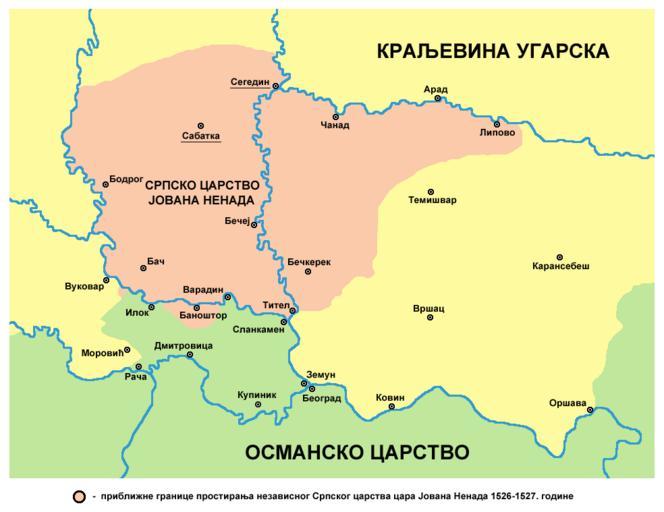 | Keywords: Serbian empire07 map.png English historical map showing Serb Empire of Jovan Nenad in 1526-1527 Serbian language version Serbian исто ијска мапа која п иказује С пско ца ство Јована енада 1526-1527 године ве зија на с пском језику 2009-02-09 own assumed PANONIAN References Veselin P Dželetović Poslednji srpski car - Jovan Nenad Poeta - Beograd 2007 Dr Aleksa Ivić Istorija Srba u Vojvodini Novi Sad 1929 Milan Tutorov Mala Raška a u Banatu Zrenjanin 1991 Drago Njegovan Prisajedinjenje Vojvodine Srbiji Novi Sad 2004 Dr Dušan J Popović Srbi u Vojvodini knjiga 1 Novi Sad 1990 Peter Rokai Zoltan Đere Tibor Pal Aleksandar Kasaš Istorija Mađara Beograd 2002 Vladimir Ćorović Ilustrovana istorija Srba knjiga četvrta Beograd 2006 Dr Milenko Palić Srbi u Mađarskoj - Ugarskoj do 1918 Novi Sad 1995 The Times History of Europe Times Books 2002 Source and licence self made map by user PANONIAN Maps of the history of Vojvodina Maps of the Ottoman period in the history of Serbia Maps of the history of Bačka Maps in Serbian Jovan Nenad |