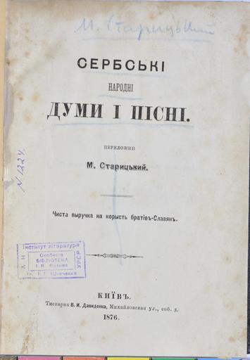 Keywords: Serbian folk songs 1346.jpg Се бські на одні думи і пісні Київ 1876 Титульний а куш 1346 З особистої бібліотеки І Ф анка 1876 Institution Shevchenko Institute of Literature Digital Collection PD-old-70-1923 1790 books from Germany Franko Personal Library Collections of books in libraries in Ukraine Shevchenko Institute of Literature Uploaded with VicuñaUploader