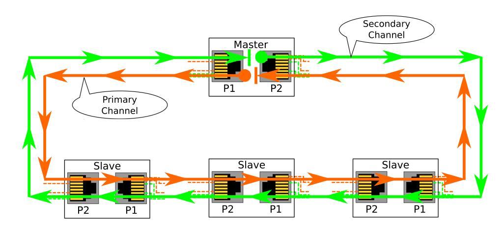 Keywords: SERCOS III Control Interface Ring Topology diagram.svg en Diagram illustrating the interconnection and data flow in a SERCOS III industrial control interface network in ring configuration own SCH56 2009-07-23 Translation possible Created with Inkscape Network diagrams IEC standards SERCOS SVG network diagrams |