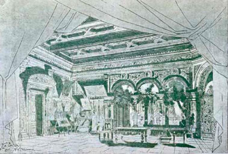 Keywords: Set by Lemeunier for Act 3 La Tosca 1887.jpg en Stage set by Lemeunier for Act 3 of Sardou's play La Tosca Cavaradossi's villa http //www puccini it/scientifica/MostraTosca pdf plate 6 p 22 Lemeunier 1887 PD-Art Ink drawings Set designs Victorien Sardou |